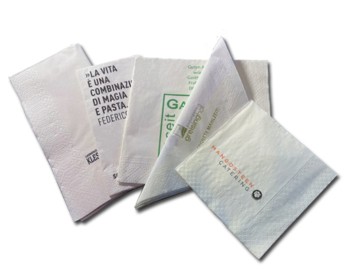 Für die Gastronomie eignen sich Cocktail-, Lunch- oder Dinner-Servietten im Flexodruck, hier können Sie aus 1-, 2-, oder 3-lagigen Servietten im 1/4- oder 1/8-Falz wählen. Hier kann die gesamte Tissue-Serviette bedruckt werden, besonders edel und empfehlenswert sind hier weiße Servietten mit farbigem Aufdruck.
